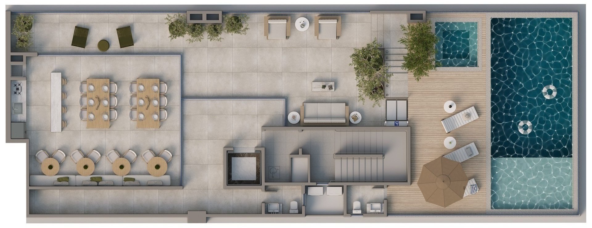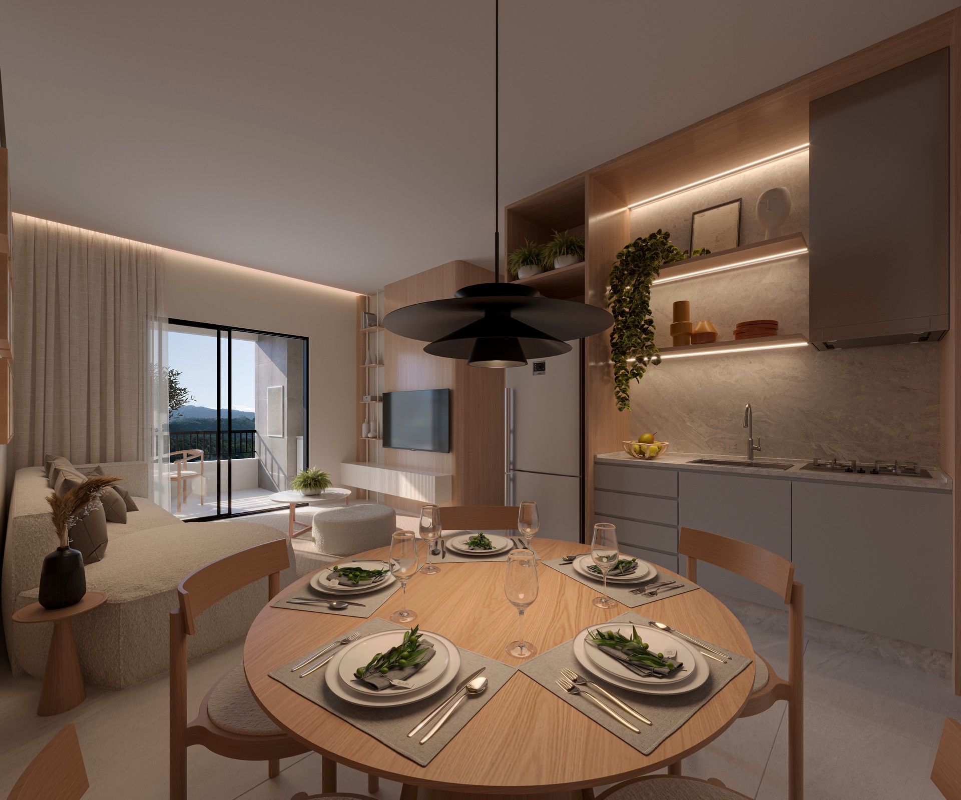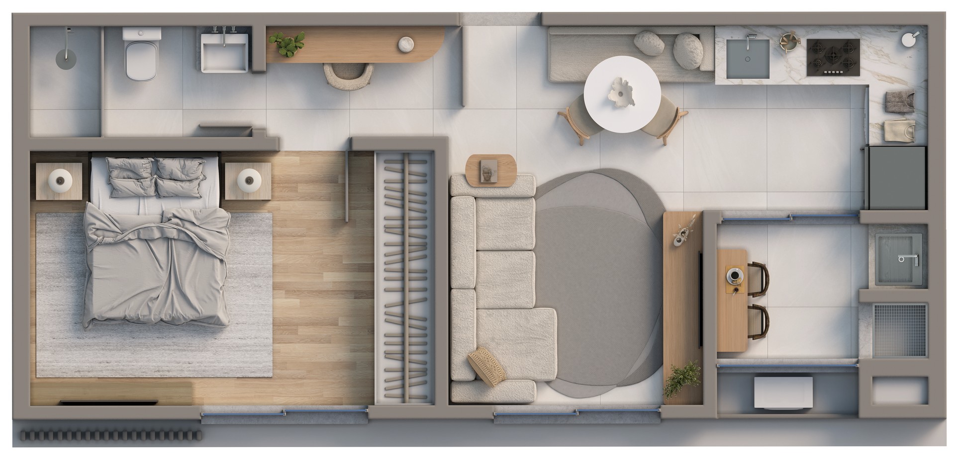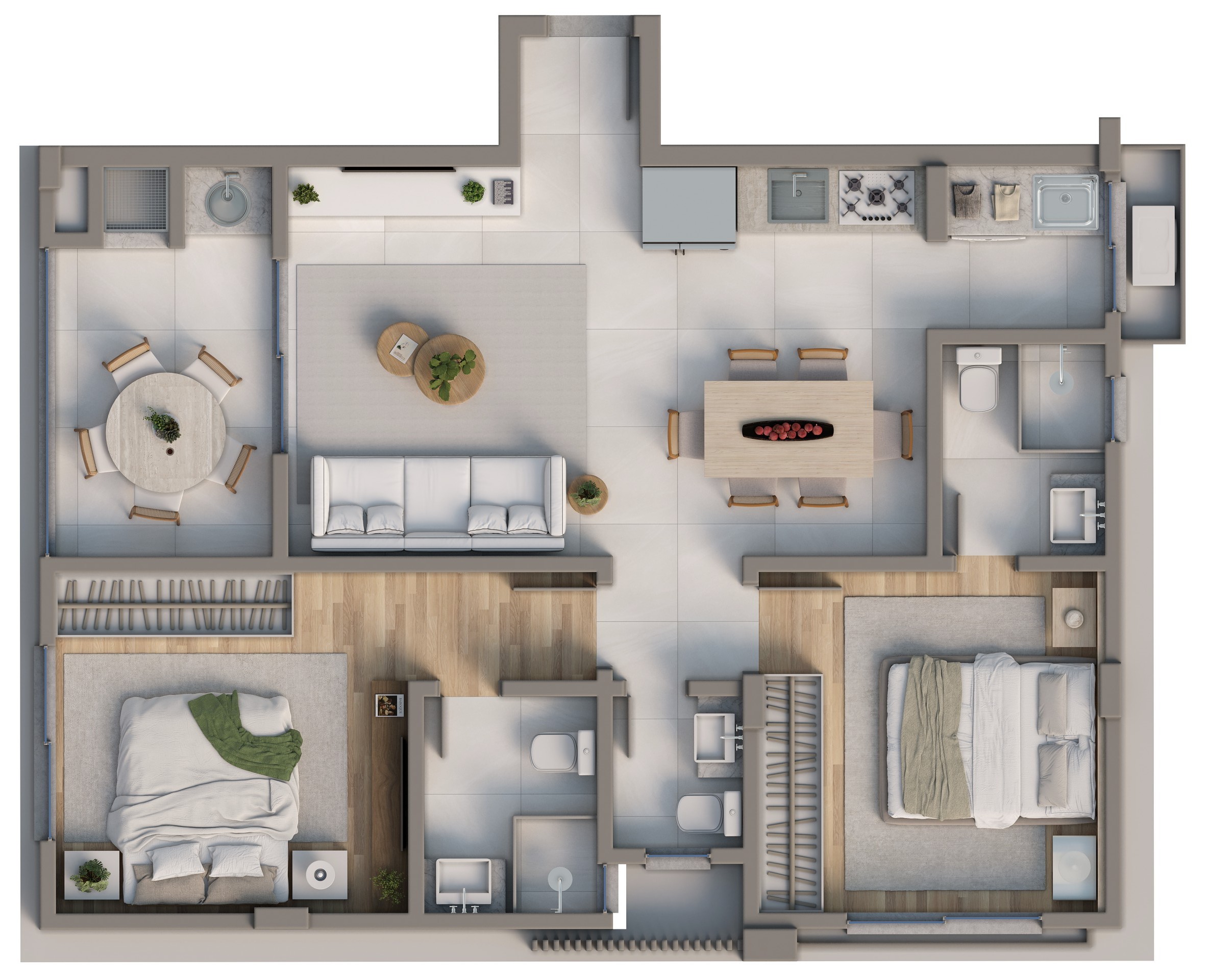 • Porcelanato nas áreas sociais e piso vinílico nas áreas íntimas.