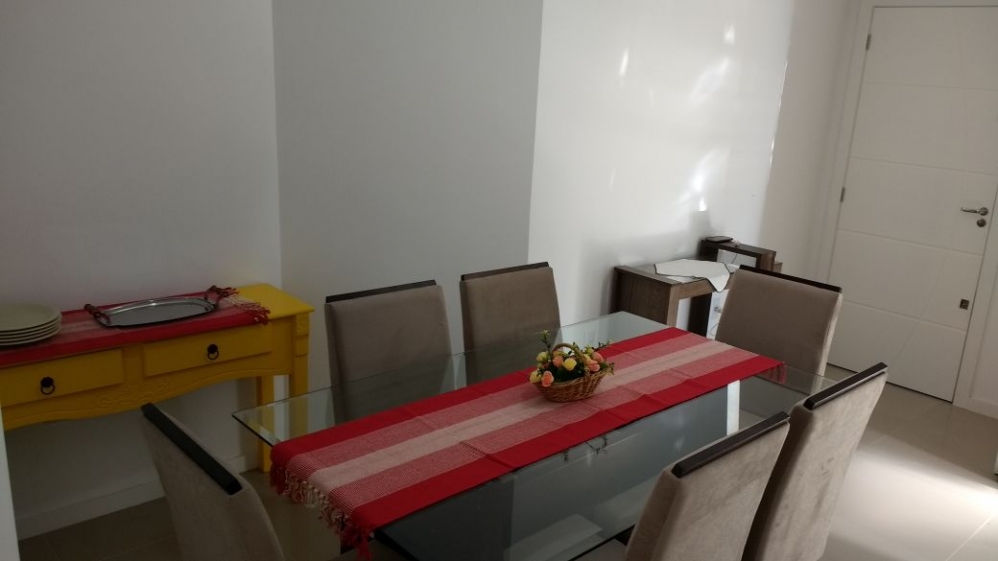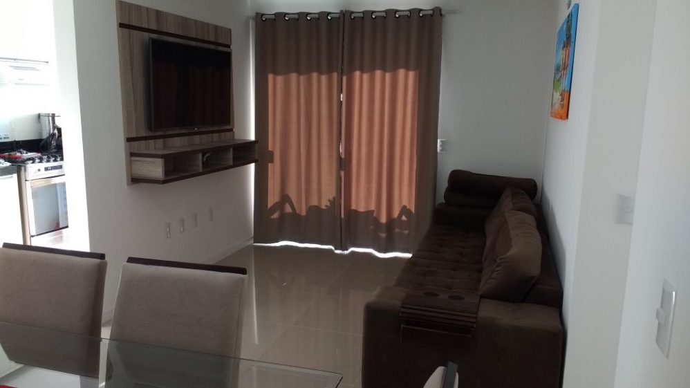 Sala de estar e jantar integradas com tv;